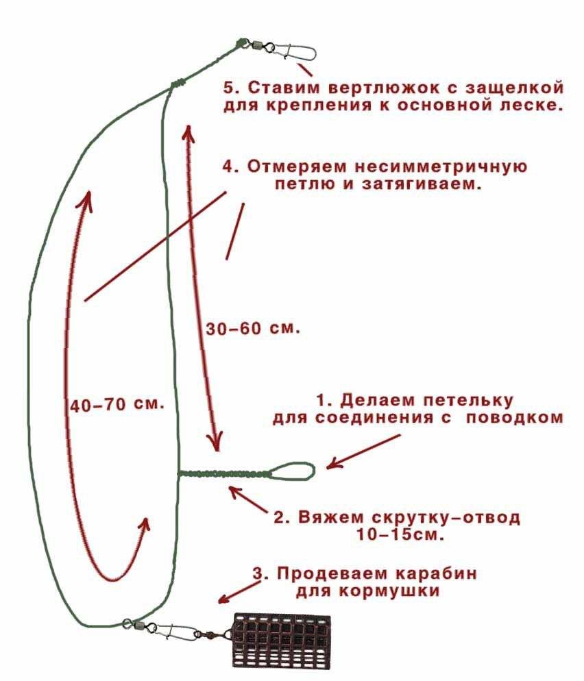 Монтаж несимметричной петли дело кропотливое и ответственное. Заранее приготовьте необходимые составляющие оснастки. Это отрезок лески, кормушка, вертлюг и поводок. Вязка проводится в несколько этапов.