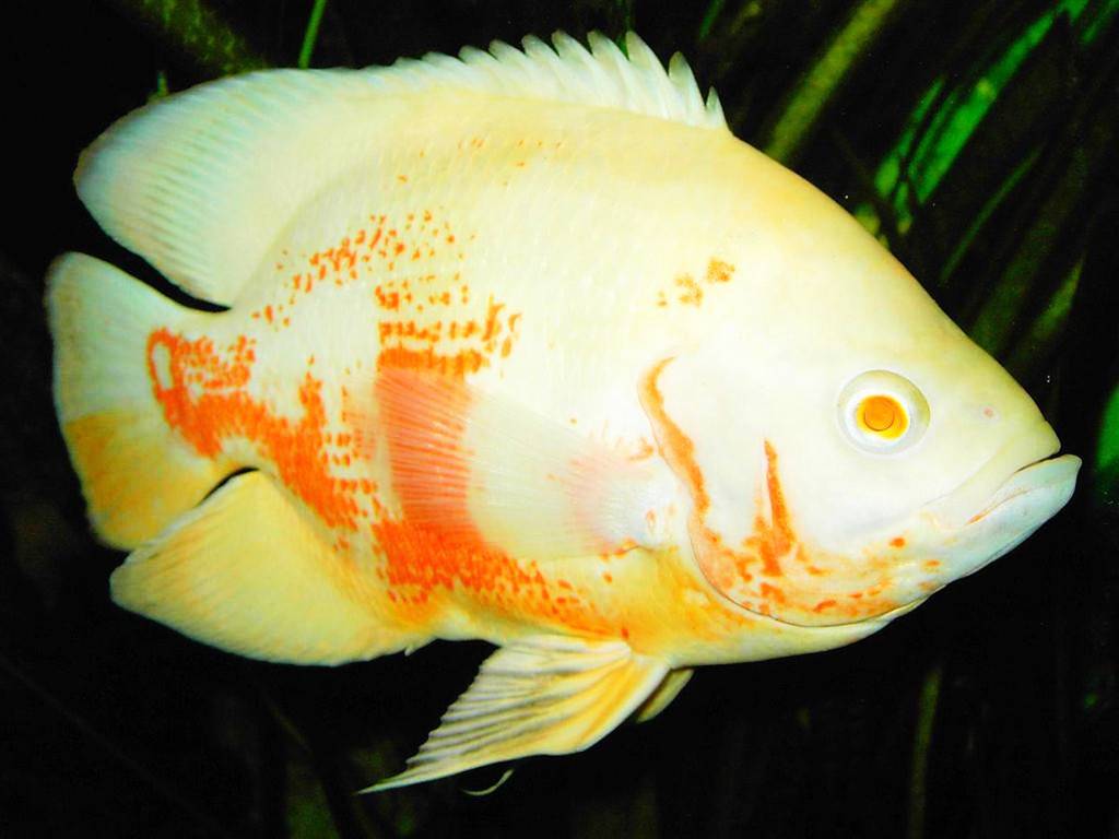 Астронотус альбинос . Его белое тельце имеет оранжевую и красную заливку. У альбиносов розовые или оранжевые плавники и глаза без темных пигментов.