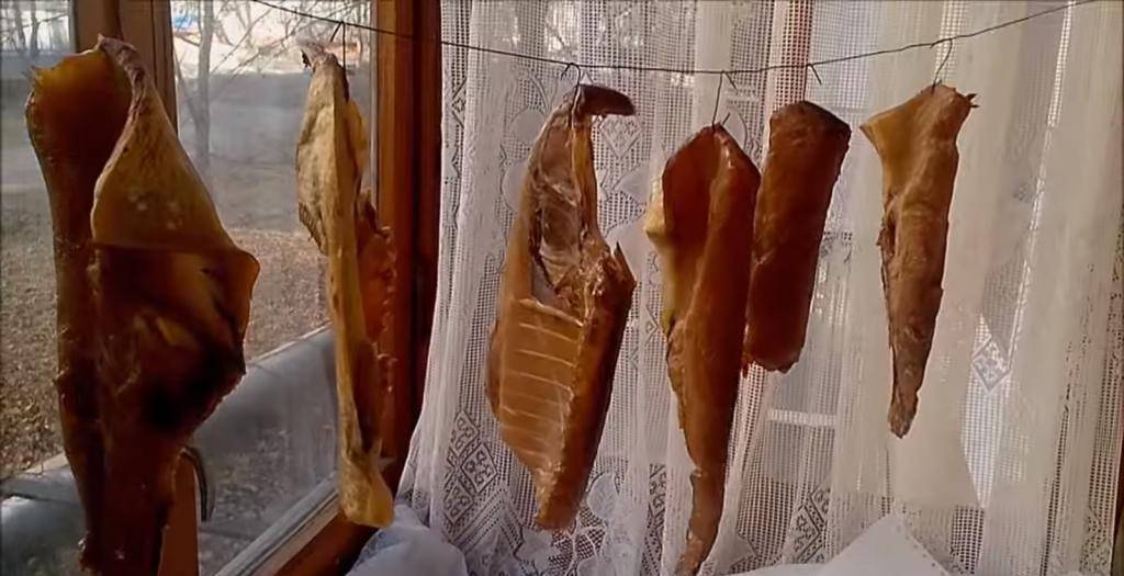 Важно помнить, что летом такой продукт нужно защищать от мух, поэтому подвешенные куски обязательно нужно накрыть несколькими слоями неплотной дышащей ткани, чтобы насекомые не смогли отложить там личинки и испортить многодневный труд