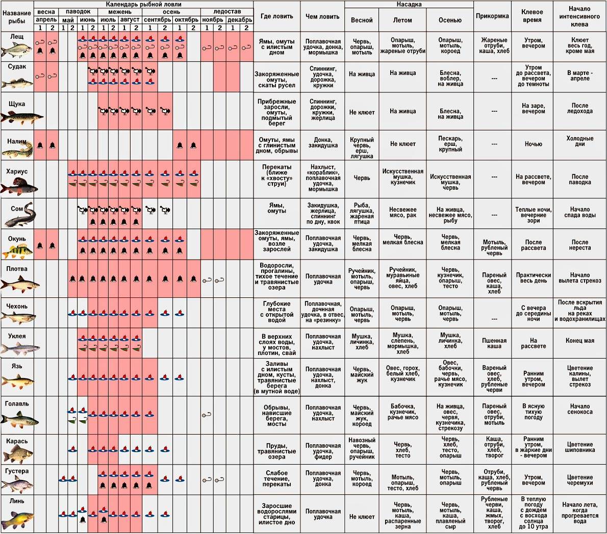Календари клева некоторых видов рыбы, которая водится в Подмосковье, представлены ниже: