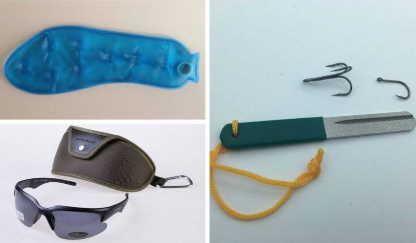 В эту группу инвентаря входят химическая грелка (можно найти даже в виде вкладышей в обувь), рыболовные очки для лучшего обзора воды в проруби (при ярком солнечном дне появляющиеся на поверхности блики напрягают глаза) и приспособление для заточки используемых крючков на месте.