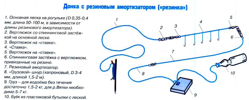 Затем к резинке нужно прикрепить основную леску. В 1-2 метрах от резинового амортизатора следует сделать 5-6 петелек с интервалом 30-50 см. К ним нужно будет прикрепить поводки с крючками.