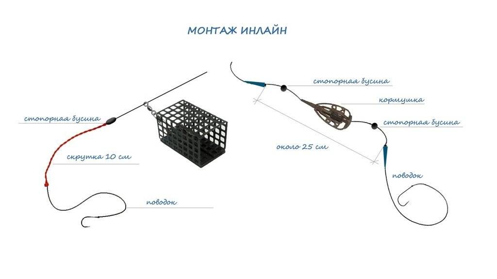 «Инлайн» это базовая оснастка в фидерной ловле. Для ее монтажа основную леску пропускают через крепежное отверстие кормушки, на конец лески привязывают карабинчик или устанавливают дробинку-стопор, после чего к леске крепится поводок с крючком. Оснастка «инлайн» является скользящей, так как кормушка ничем не зафиксирована на леске. Ее преимущество заключается в простоте монтажа и высокой чувствительности, а недостаток – в склонности к захлестам. Эта оснастка является единственной разрешенной в спортивной карповой ловле, так как при обрыве основной лески кормушка просто сваливается с лески и не мешает рыбе.