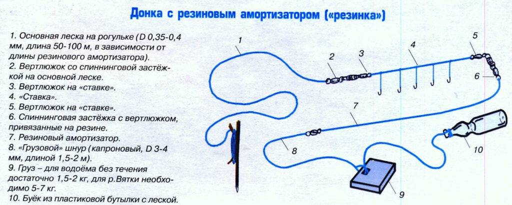 Существует огромное множество вариантов оснастки донки, причем все они разные и специфические. Например, донная снасть на сома будет сильно отличаться от снасти на карася или леща. Все оснастки настолько не похожи, что сложно остановиться на какой-то одной. Давайте рассмотрим самую прочную и надежную из всех. На первых порах она сгодится практически для любой рыбы.