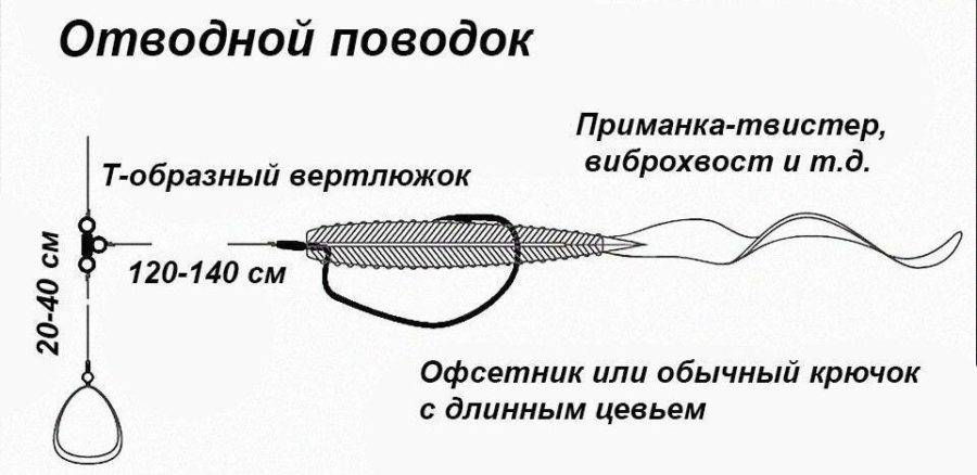 Собирается оснастка достаточно просто: на конце основной лески располагается вытянутое грузило продолговатой формы, а в сантиметрах 20-50 от него жестко крепится крючок жалом верх. Приманку лучше использовать такую, что способна извиваться всем телом. Впрочем, более привычные твистеры и виброхвосты работают не хуже.
