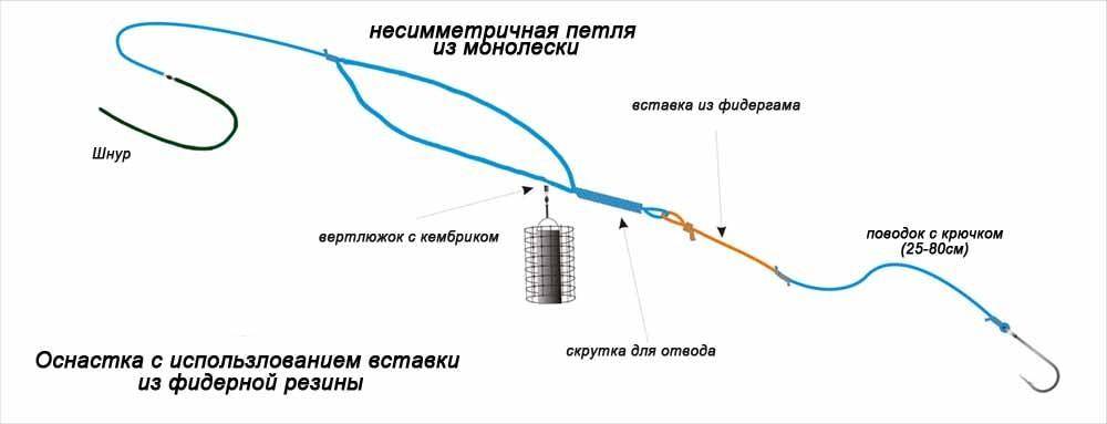 При использовании вставок из резинок фидерная оснастка соединяется с леской «петля в петлю», что увеличивает шанс исключения обрыва.