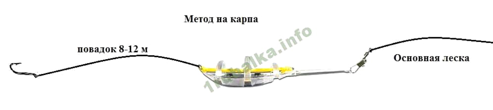 В принципе можно сразу кормушку крепить на леску. Но для карпа, как впрочем и любой другой рыбы, лучше иметь небольшой отвод, длинною 5-25 см, который даст нам «эффект патерностера». У нас будет небольшое плечо, которое еще более нивелирует тяжесть кормушки при поклевке. Длинный отвод 15-25 см, необходим в случаи ловли на сильно заиленном водоеме или в местах с высокорастущей травой.