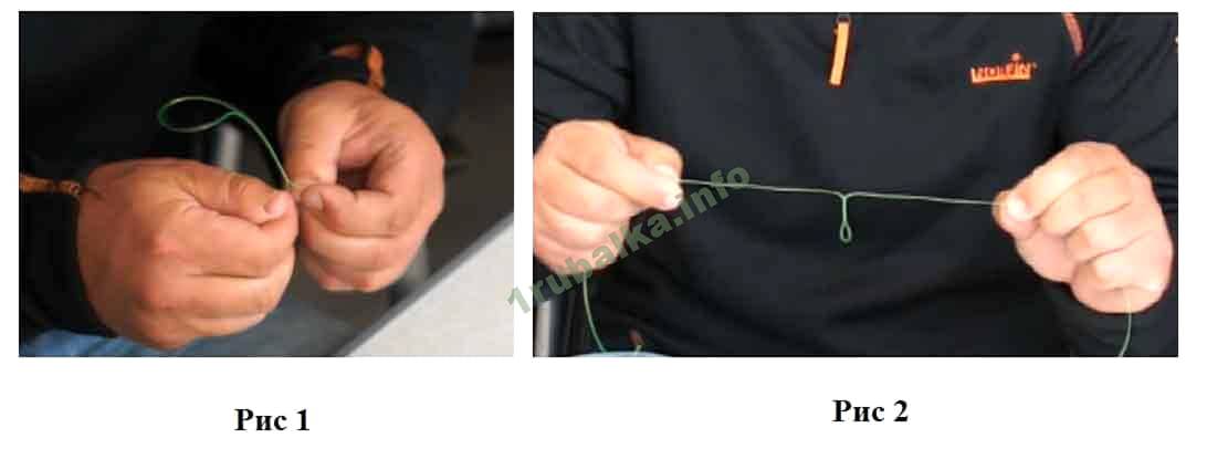 Теперь вяжем скрутку, для этого берем леску толщиною 0,25-0,3 мм, складываем ее, зажимаем большим и указательным пальцами и начинаем крутить в одном направлении (смотри рис 1), для того чтоб на выходе у нас образовалось небольшое кольцо, куда мы будем крепить повадок, скрутку подтягиваем (смотри рис 2). Скрутка делается длинною 15-20 см, на конце нашей скрутки, мы вяжем петлю восьмерку, дабы уберечь ее от самопроизвольного развязывания. Усы, что останутся после вязки скрутки, обрезаем под ноль.