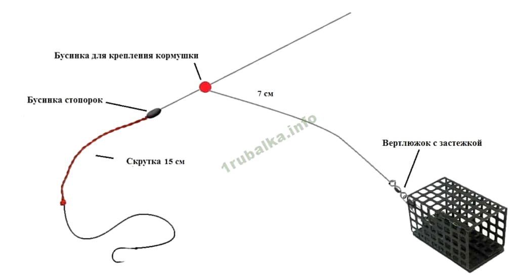 - На конце лески нужно связать петлю, диаметром 15–20 см, которую следует разрезать на две неровные части. К этим концам закрепляют вертлюгу. На той части, что короче, следует зафиксировать кормушку с карабином, а на другой — поводок и крючок.