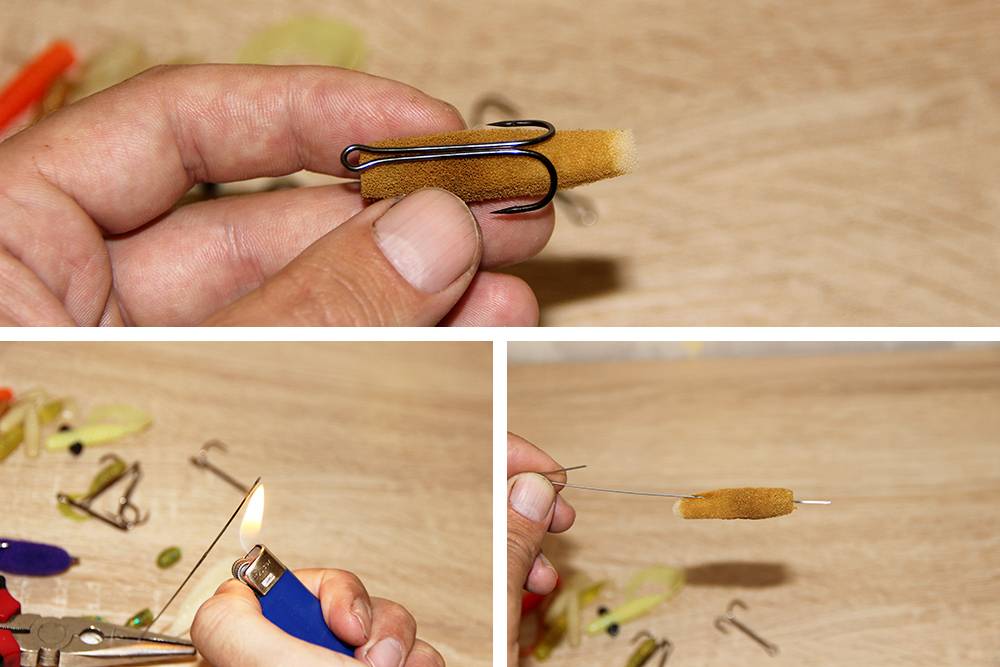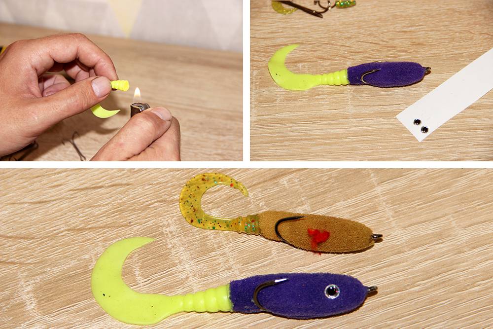После всех манипуляций с вырезанием и монтажом двойника, ищем у себя в ящике старый твистер или виброхвост, отрезаем часть тела с хвостом и нагреваем над пламенем до тех пор, пока силикон не станет текучем. Как только нагреваемый край твистера поплыл, быстро приклеиваем его к нашей поролоновой заготовке. Всё, приманка готова!