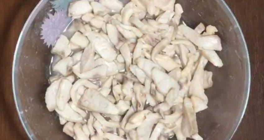 Нарезаем филе тонкими ломтиками, толщиной приблизительно полсантиметра.