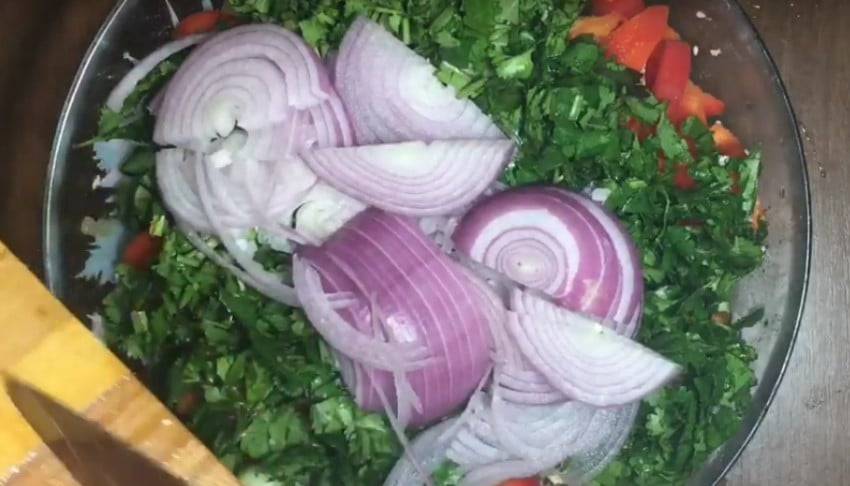 Кинзу нарезаем мелко, как на салат. Лук нарезанный кольцами поджариваем на растительном масле до золотистого цвета.