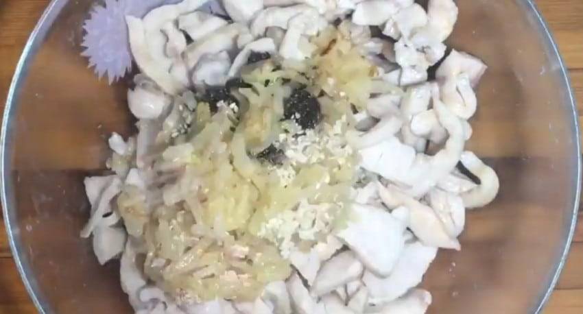 Выливаем: соевый соус и поджаренный лук с растительный маслом.