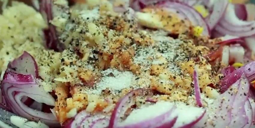 Очень простой в приготовлении рецепт блюда. Он получается пряным, с легкими нотками свежести. Вместо обычного репчатого лука мы будем использовать красный (ялтинский), поэтому закуска получится не слишком острой!
