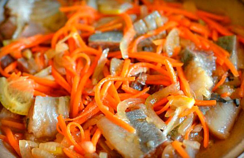 Измельчите продукт средними кусочками. Переложите рыбу в стеклянную, эмалированную или керамическую емкость и засыпьте солью, перемешайте кусочки, чтобы каждый пропитался ею Далее влейте в емкость уксус и еще раз тщательно перемешайте рыбу. Дайте ей промариноваться в уксусе минимум 35 мин. Очистите лук и измельчите его: половину кубиками, половину полукольцами Чеснок очистите и мелко порубите. Лук, измельченный полукольцами, и чеснок добавьте в рыбу, перемешайте, оставьте на полчаса. Морковь очистите, и потрите на терку для моркови по-корейски или же на обычную крупную терку. Сдобрите ее пряностями и специями, указанными в рецепте, однако, с расчетом на то, что они еще понадобятся для приготовления заправки. В сотейнике на разогретом масле обжарьте оставшийся лук. Добавьте в емкость все специи и соус спайси, готовьте 5 мин. Выложите получившуюся смесь в рыбу, туда же отправьте морковь, перемешайте. Емкость с рыбой отправьте в холодное место на 12 час. Это время необходимо для того, чтобы рыба пропиталась и стала пригодной для еды. Подавать такое блюдо можно с зеленью, соевым и более острыми соусами, а также с гарнирами.