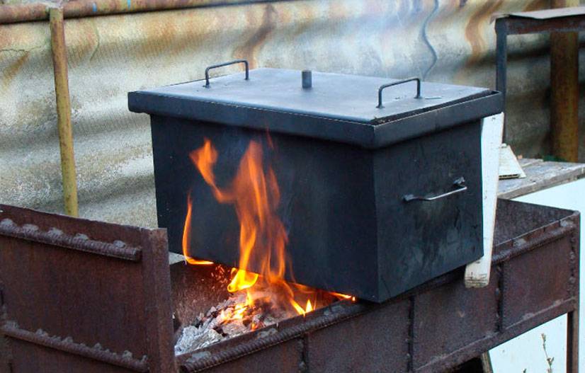 Затем необходимо установить коптильню на огонь – тут очень важно не дать щепкам пересохнуть. Ведь в копчении самое главное, чтобы было достаточное количество дыма