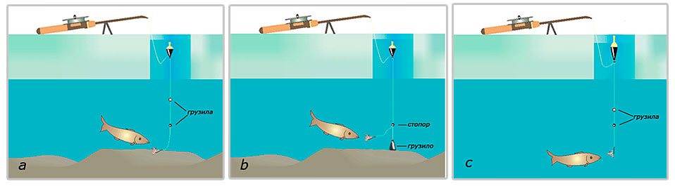 Основная задача при монтаже такой снасти – остановить на нужной глубине погружение насадки. Достичь приемлемого результата можно, если на леске прицепить стопор, который должен свободно проходить через кольца и тюльпан и не сдвигаться от давления на него поплавка.