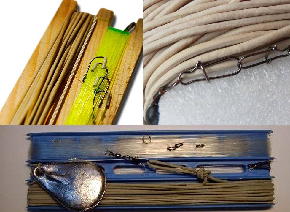 - К резинке крепят леску с крючками. В зависимости от расстояния заброса груза на «резинку» можно крепить от 5 до 10 крючков.