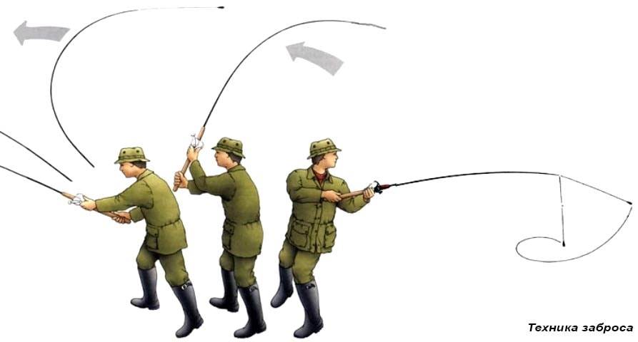 - Бросок — отвод удилища, удерживаемого горизонтально, за спину и замах сбоку под углом.