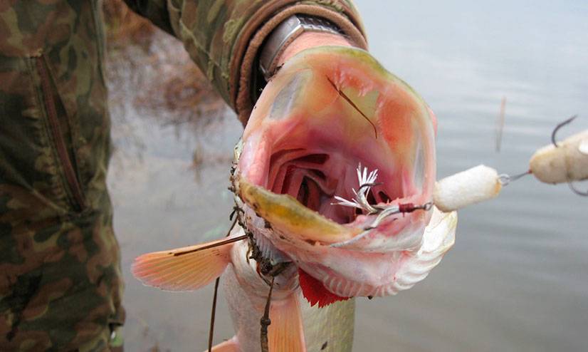 Используемые тройники должны быть достаточно острые. Пасть добычи в месте просечения довольно твердая.