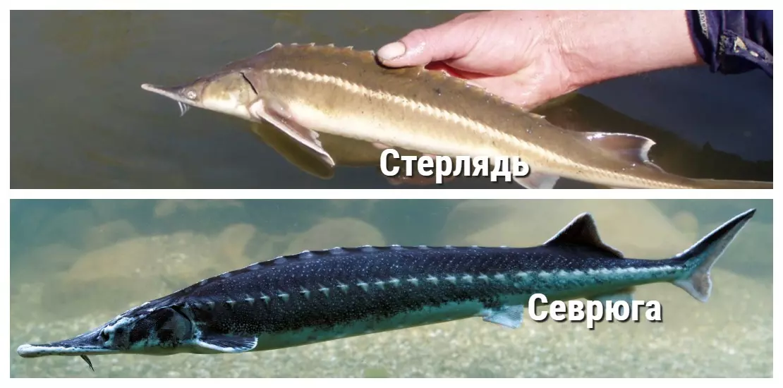 Стерлядь от севрюги можно отличить по строению туловища, так как у последней длина рыла составляет 60-62 % от общего размера головы. Вырастает севрюга до 220 см, а ее масса иногда достигает 80 кг. В среднем особи весят до 9 кг, что в несколько раз превышает среднюю массу стерляди.