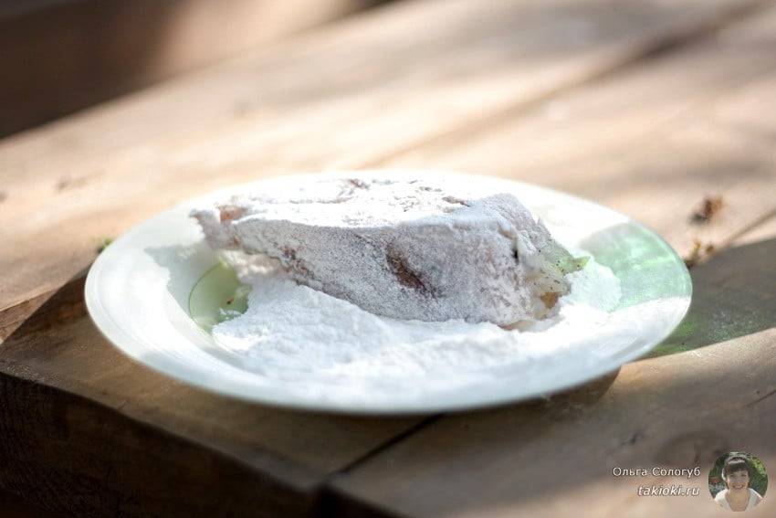Промариновавшийся кусочек я обваливаю в муке, а потом окунаю в яичную массу. Затем этот же кусочек рыбы обваливаю в молотых сухарях. Благодаря такой двойной панировке, филе получается нежным и сочным.