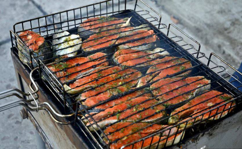 - Чтобы рыба не приставала к решетке, перед использованием подержите ее над огнем, чтобы она обгорела. Также щедро смажьте решетку растительным маслом перед тем, как выложить рыбу.