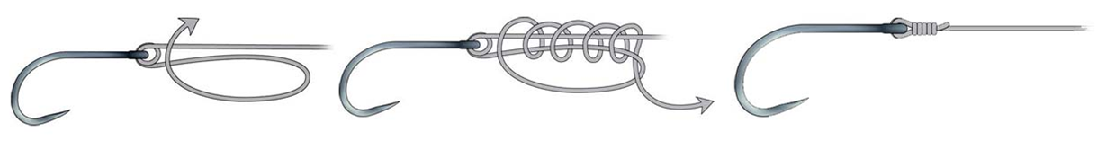 - Концом нити накручивать около 5 раз вокруг основной лески и внутри имеющейся петли.