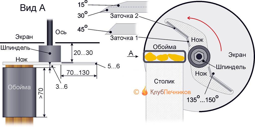 Нож не обязательно делать из инструментальной стали, подойдет конструкционная среднеуглеродистая, напр. Ст40, Ст44. А вот обойма для подачи заготовок нужна обязательно, иначе от первого же удара ножа они пулями разлетятся во все стороны.