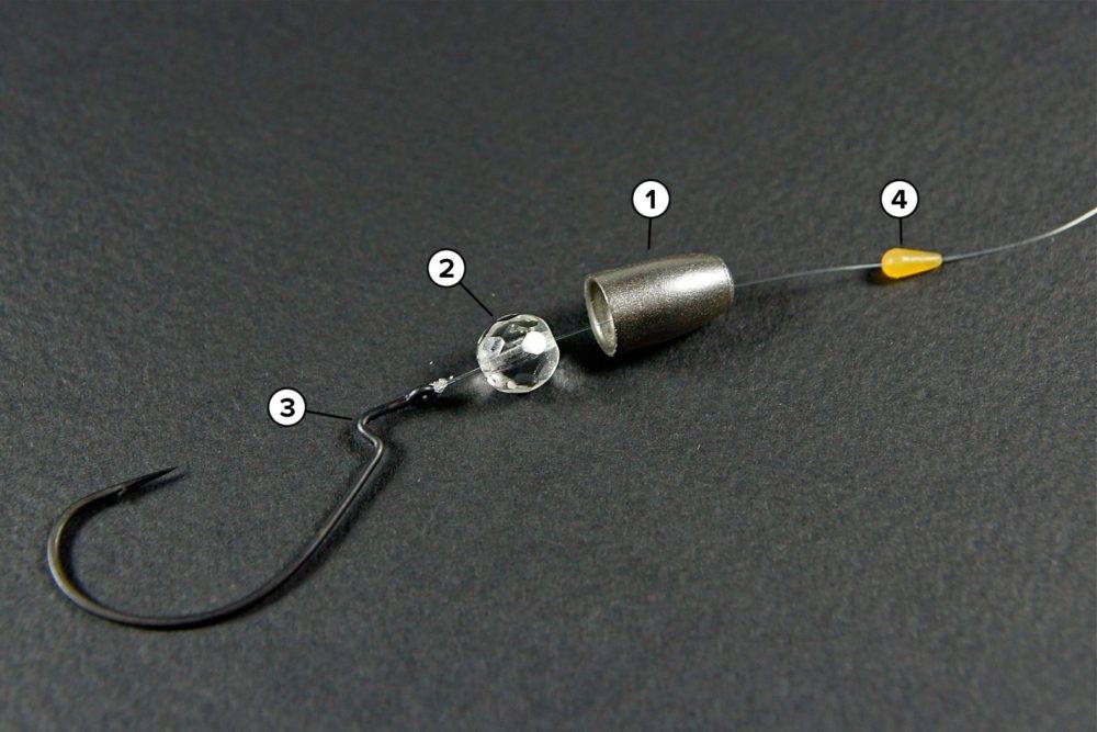 Стандартная оснастка типа Техас (см фото ниже) собирается на леске, по которой должен беспрепятственно перемещаться груз-пуля (1), что заслужил своё название из-за схожести с формой боевой пули. Дополнительно, монтируется офсетный (3), а в некоторых случаях одинарный крючок, и стеклянная бусина (2). Иногда для фиксации длины перемещения груза используют силиконовый стопорок (4).