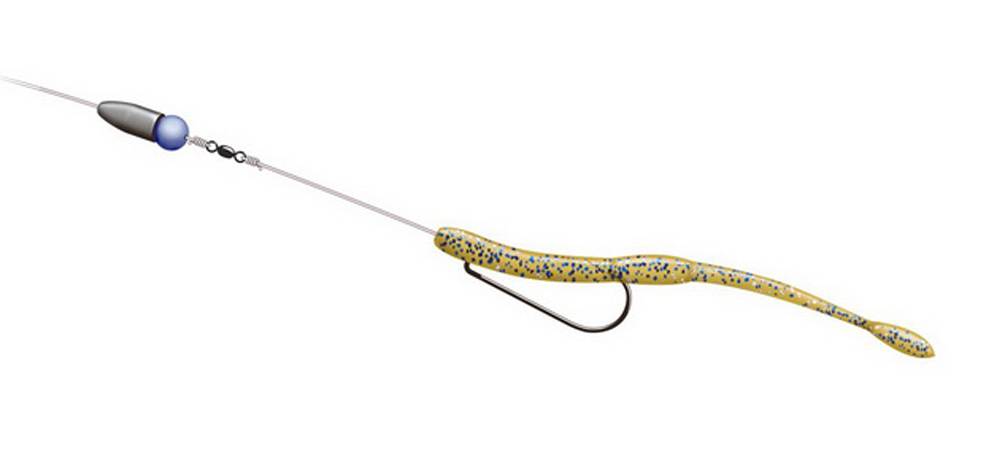 Оснастка спиннинга Техас устроена довольно просто – силиконовый червь привязан офсетным крючком к основной леске, по которой свободно скользит грузило в виде пули. Между пулей и крючком устанавливают бусинку, но делать это и необязательно. Благодаря пулеобразной огрузке, монтаж отлично проходит все подводные препятствия, не застревая в них и не цепляясь за них.
