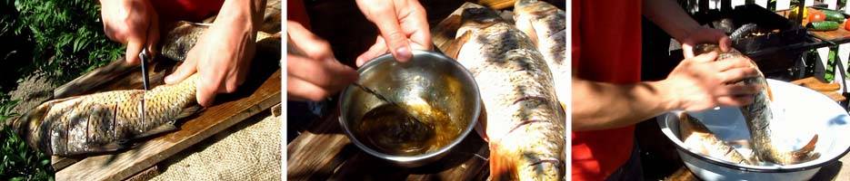 Готовя карпа целым, на тушке делают поперечные надрезы глубиной 0,5 см на расстоянии 1 см друг от друга или даже сеточку. Это позволяет разрубить косточки и дает возможность маринаду проникнуть глубже, благодаря чему готовое кушанье становится намного приятнее есть.