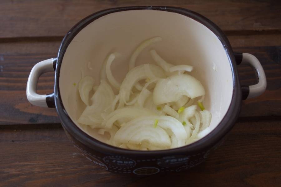 - Лук освободить от верхнего слоя и порезать толстой соломкой.