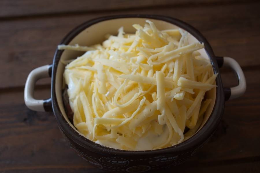 - За 5 минут до готовности посыпать сыром. Затем вынуть и украсить зеленью. По желанию можно подавать к блюду соус бешамель