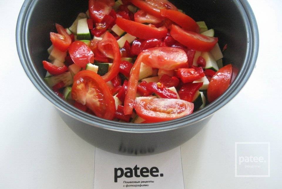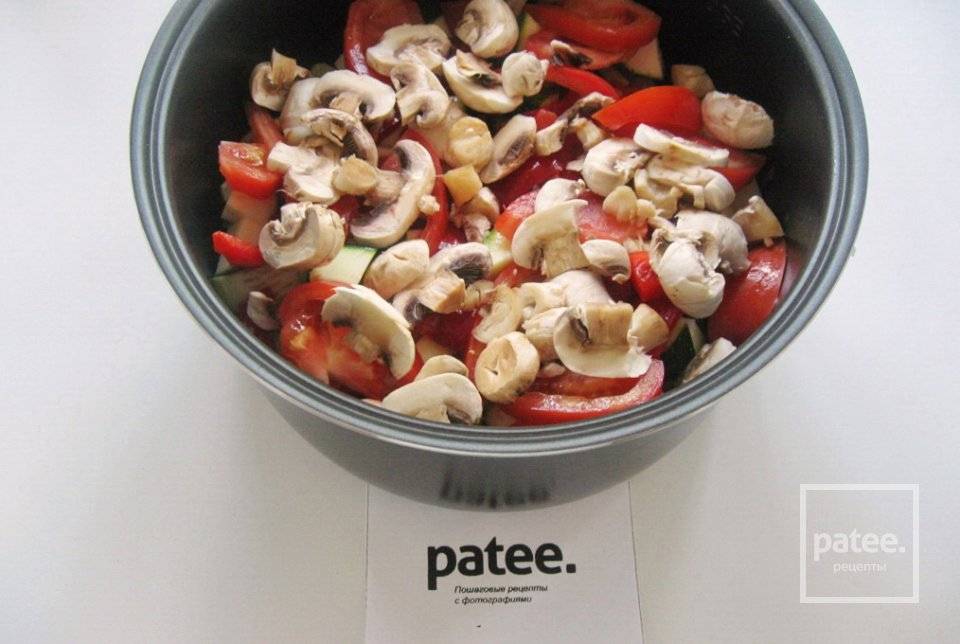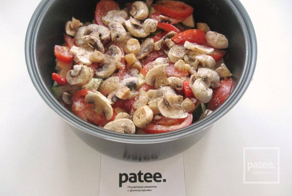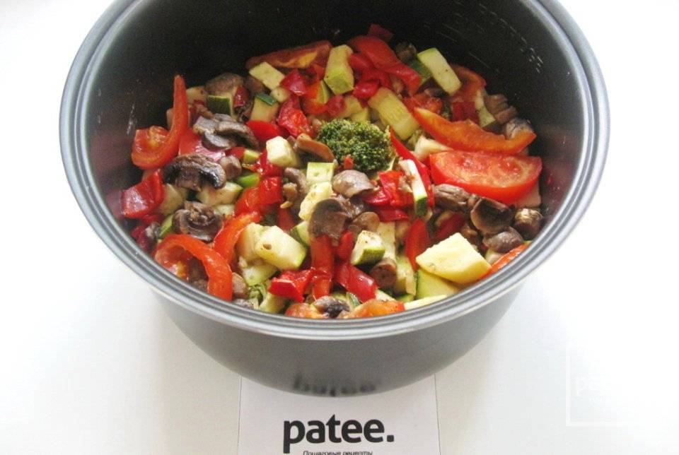 Наконец овощи все порезаны. Наливаем растительное масло(у меня оливковое), солим и перчим по вкусу. Овощи пустят сок, но можно налить совсем немного воды. Ставим кастрюлю в мультиварку. Включаем режим “Тушение”.