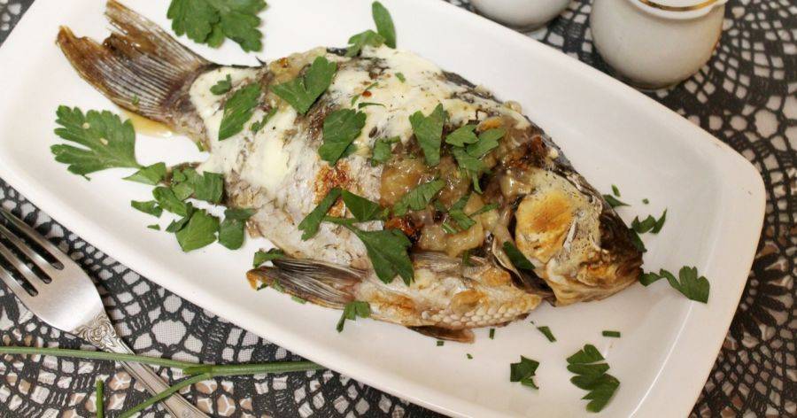 При таком способе приготовления запеченный в сметане карп получается хрустящим.