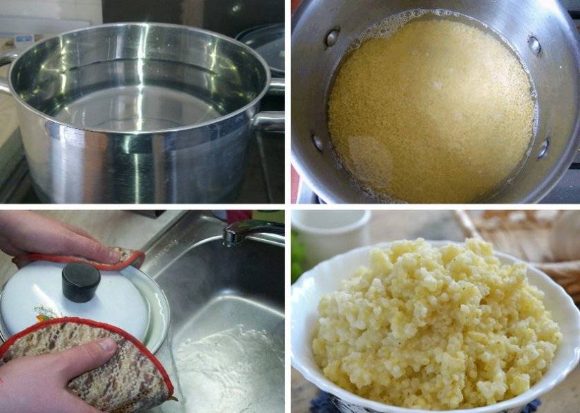 - Для придания каше вязкости в нее на последнем этапе добавляют муку или манную крупу, постоянно помешивая.