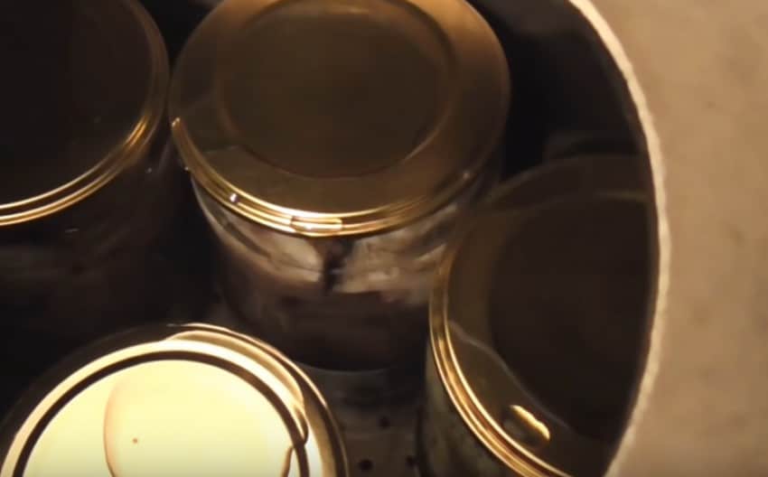 Залить горячим маслом и укупорить ключом. Готовить в автоклаве при температуре 110℃ до 1.5 ч. При длительной тепловой обработке мякоть разваривается, а мелкие косточки практически не ощущаются при еде. После остывания автоклава заготовки достать и убрать на хранение в кладовую.