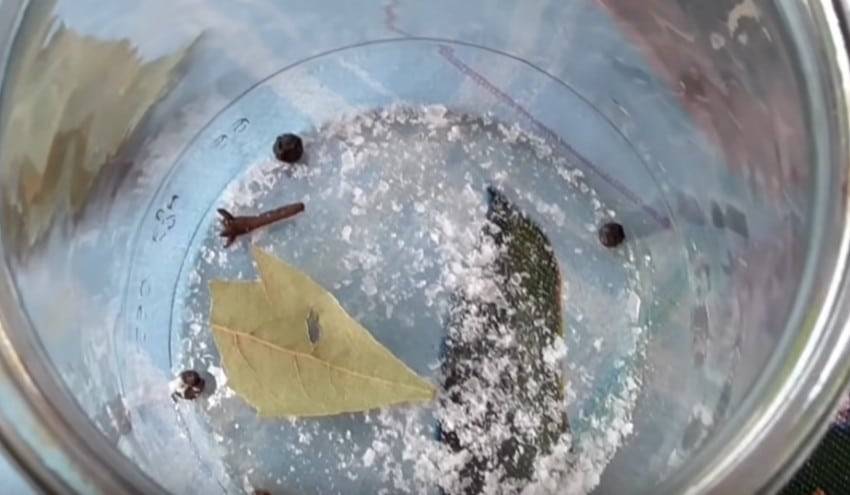 - Банки вымойте с содой, позвольте им обсохнуть. На дно каждой емкости положите по листику лавра и паре горошин перца.