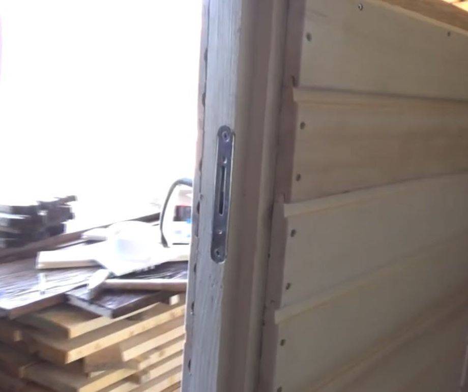 Дверку обиваем фольгой, внутрь кладём утеплитель, затем обшиваем вагонкой с двух сторон.