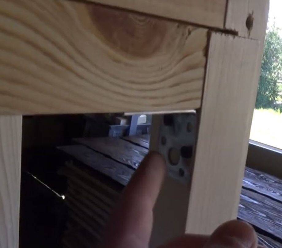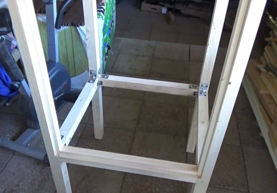 Каркас делаем из строганных брусков сечением 40х40. Длина вертикальных — 140 см; горизонтальных (внутренний размер) — 60 см. Соединяем уголками на саморезы. Высота ножек — 30 см.