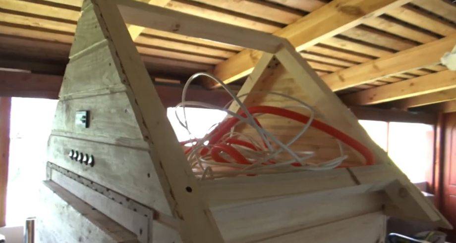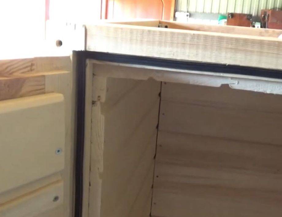 Из брусков из дерева делают основание для камеры. Затем к нему прибиваются ровные доски, которые должны прилегать очень плотно друг к другу. Это делается для того, чтобы дым не выходил через щели. Затем в крыше делается отверстие, в которое выводится труба.