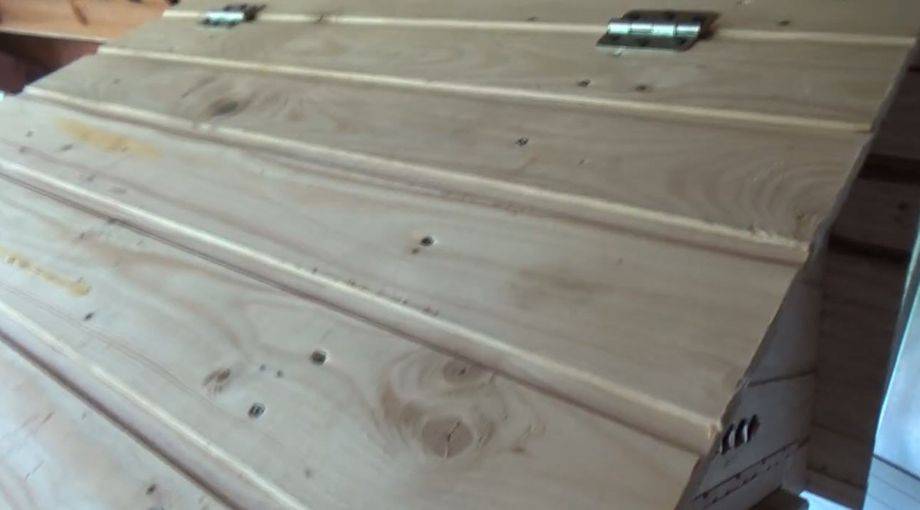 Сверху также бьём вагонку, одну сторону можно сделать открывающейся.