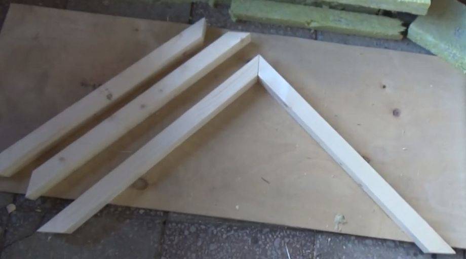 Делаем заготовку для крыши: четыре бруска, запиленных под 45 градусов. Длина каждого — 65 см.
