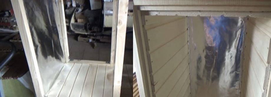 Внутри на все стенки прибиваем фольгу, после зашиваем вагонкой.