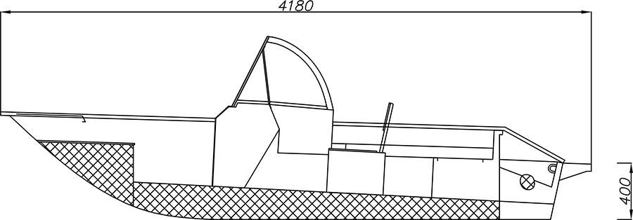 Флоры (высотой 200 мм.) и шпангоутные рамки из алюминия толщиной 3 мм с фланцами 30 мм. Зашивка бортов — алюминиевые листы толщиной 1,5 мм. Днищевые реданы выполнены приварными из угольника 45х20х3. Днище внутри и киль снаружи подкреплены