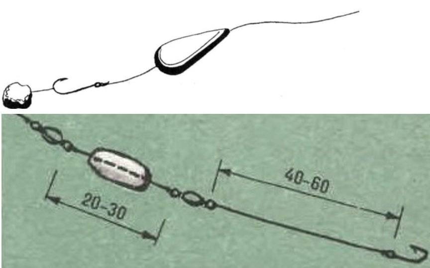 Фактически в данном случае приманка используется в качестве подкормки и наживки. Второй вариант отлично подойдёт для ловли леща и карпа. В этом варианте оснастки рыба засекает себя самостоятельно, а рыболову необходимо лишь вытянуть её из воды. Можем порекомендовать вам использовать для поводков леску плетёнку с толщиной 0,1 — 0,15 миллиметра