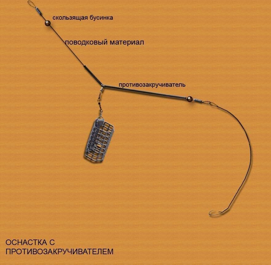 Взяв участок лески около 50 см, необходимо подвязать вертлюжок и одеть стопорную бусину. Леска просовывается в противозакручиватель и подвязывается на спарку вертлюжка. Туда же крепится поводок.