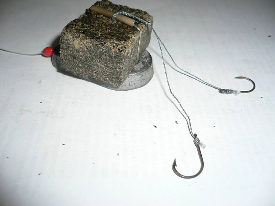 - Брусок макухи крепят к грузилу резинками или привязывают леской. Крючки втыкают в макуху, чтобы не допустить запутывание оснастки.