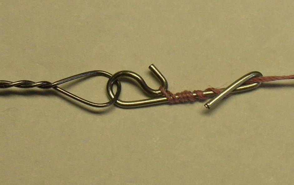 Однако, надежнее использовать безузловую застежку. Диаметр проволоки безузловки толще 0.3-0.4 миллиметровой скрутки в 2-3 раза. Поэтому меньше давление на шнур при нагрузке в месте соединения, по законам физики. Да и тесты показывают, что привязывание к безузловке крепче на разрыв, чем простое вплетение в скрутку или узловое соединение.